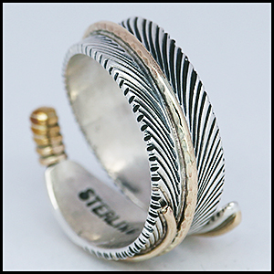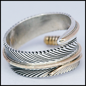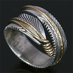 | NAVAJO/ナバホ族のアーティスト Harvey Mace/ハーヴィー・メイスに制作を依頼したリングです。 躍動感のあるフェザーモチーフのリングは、指を包み込むようなデザインに仕上がっています。 センターラインには12KGF(12金張り)が施されています。 美しい曲線と共にフェザーがしっかりとデザインされていますので、どなたでもお楽しみ頂ける作品です。 | ||
