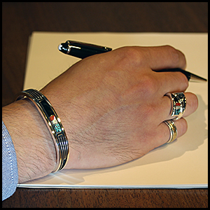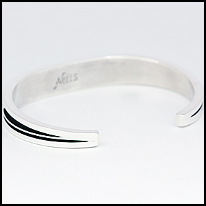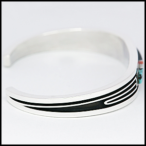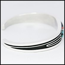| NAVAJO/ナバホ族のアーティスト Albert Nells/アルバート・ネルスに制作を依頼したバングルです。 テーパー付きのスタイリッシュなフォルムに、インレイが施された代表的作品の一つです。 銀と黒のコントラストがしっかり効いており、美しい石はバランスよくセットされています。 シンプルで綺麗なスタイルによく映えるバングルです。 | ||
