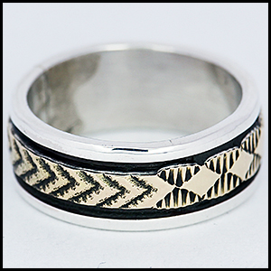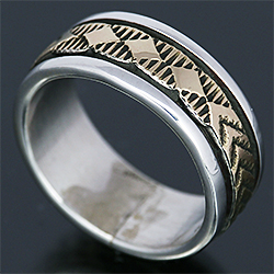 | NAVAJO/ナバホ族のアーティスト Bruce Morgan/ブルース・モーガンに制作依頼をしたリングです。 シンプルながらも深く正確なスタンプワーク、こちらのデザインは3ダイヤ+アローになります。 センターは14Kを使用しているため高級感があり、スタイルを選びませんので様々な場面でお使い頂けます。 | ||