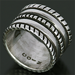 | NAVAJO/ナバホ族のアーティスト Darryl Dean Begay/ダリル・ディーン・ビゲイに制作を依頼したコインシルバーのリングです。 チゼルを使用することで生まれる断面の緩やかなカーブはオールドジュエリー特有の表現方法です。 機械で作ったような綺麗さではなく、地金の表面は溶かした後のス穴も見受けられ、手作りの温かみが感じられる作品に仕上がっています。 | ||