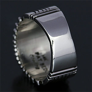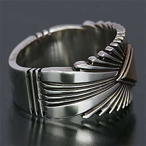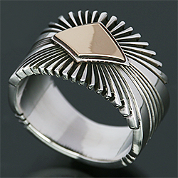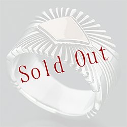 | NAVAJO/ナバホ族の女性アーティスト Patricia Bedonie/パトリシア・べドニーに制作依頼をしたリングです。 正確で美しいチゼルワークによるサンバーストデザインです。ダイヤ型のパーツは14Kとシルバーのダブルダイヤモンドで仕上げて頂いています。 側面は凹凸が鋭いエッジが効果的で、形状はテーパーになっているため指あたりがとてもよく、装着感の良いリングです。 | ||
