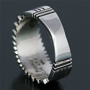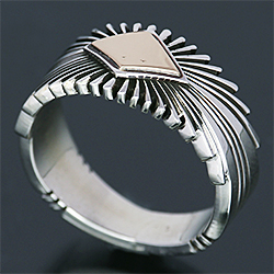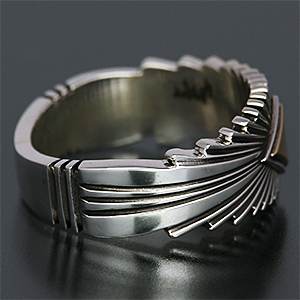 | NAVAJO/ナバホ族の女性アーティスト Patricia Bedonie/パトリシア・べドニーに制作依頼をしたリングです。 正確で美しいチゼルワークによるサンバーストデザインです。ダイヤ型のパーツは14Kとシルバーのダブルダイヤモンドで仕上げて頂いています。 側面は凹凸が鋭いエッジが効果的で、形状はテーパーになっているため指あたりがとてもよく、装着感の良いリングです。 | ||