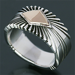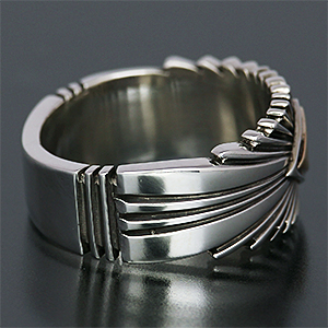 | NAVAJO/ナバホ族の女性アーティスト Patricia Bedonie/パトリシア・べドニーに制作依頼をしたリングです。 正確で美しいチゼルワークによるサンバーストデザインです。ダイヤ型のパーツは14Kとシルバーのダブルダイヤモンドで仕上げて頂いています。 側面は凹凸が鋭いエッジが効果的で、形状はテーパーになっているため指あたりがとてもよく、装着感の良いリングです。 | ||