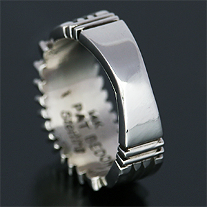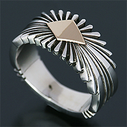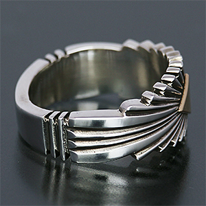 | NAVAJO/ナバホ族の女性アーティスト Patricia Bedonie/パトリシア・べドニーに制作依頼をしたリングです。 正確で美しいチゼルワークによるサンバーストデザインです。ダイヤ型のパーツは14Kを使用しています。 側面は凹凸が鋭いエッジが効果的で、形状はテーパーになっているため指あたりがとてもよく、装着感の良いリングです。 | ||