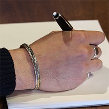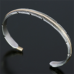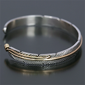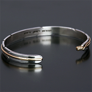 | NAVAJO/ナバホ族のアーティスト Harvey Mace/ハーヴィー・メイスに制作を依頼したバングルです。 躍動感のあるフェザーモチーフの作品です。 センターラインは12KGF(12金張り)が入っているため、洗練された落ち着いた魅力があり、シルバーとのバランスも絶妙です。 美しい曲線と共にフェザーがしっかりとデザインされていますので、どなたでもお楽しみ頂けるバングルです。 | ||