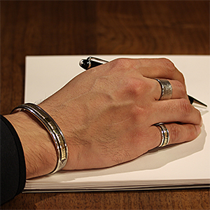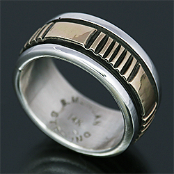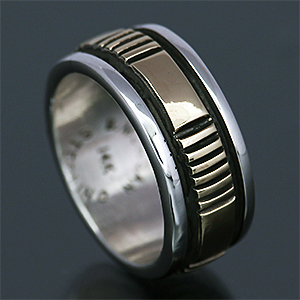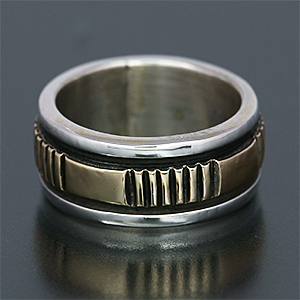 | NAVAJO/ナバホ族のアーティスト Bruce Morgan/ブルース・モーガンに制作依頼をしたリングです。 シンプルながらも深く正確なスタンプワーク、こちらのデザインはストライプ+プレーンになります。 センターは14Kを使用しているため高級感があり、スタイルを選びませんので様々な場面でお使い頂けます。 | ||