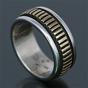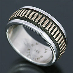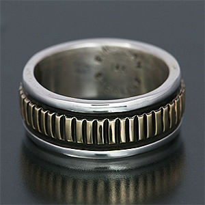 | NAVAJO/ナバホ族のアーティスト Bruce Morgan/ブルース・モーガンに制作依頼をしたリングです。 シンプルながらも深く正確なスタンプワーク、こちらのデザインはストライプになります。 センターは14Kを使用しているため高級感があり、スタイルを選びませんので様々な場面でお使い頂けます。 | ||