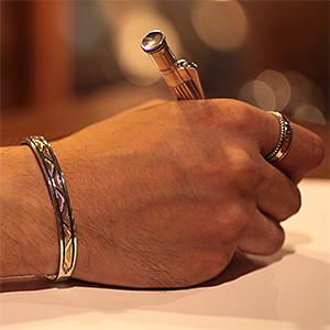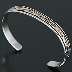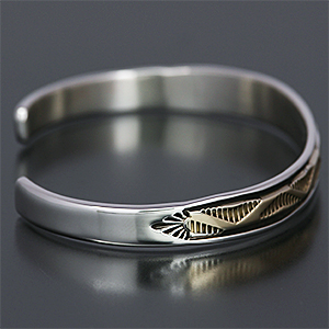 | NAVAJO/ナバホ族のアーティスト Bruce Morgan/ブルース・モーガンに制作を依頼したバングルです。 シンプルながらも深く正確なスタンプワーク、こちらはウエーブデザインになります。 センターラインは14Kを使用しているため高級感があり、スタイルを選びませんので様々な場面でお使い頂けます。 単体でも他のバングルとの重ね着けにも相性良くお楽しみ頂けます。 | ||