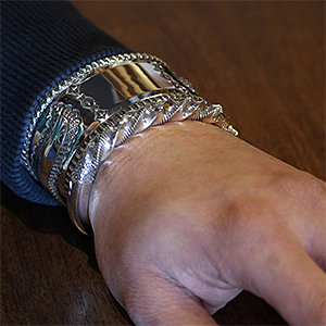 | NAVAJO/ナバホ族のアーティスト Clendon Pete/クレンドン・ピートに制作を依頼したバングルです。 10ゲージ(約2.6mm)の厚みのあるシルバー、静かなデザインの中に十分に存在感を発揮しています。 クレンドン・ピートの世界観をお楽しみください。 | ||