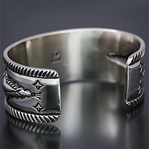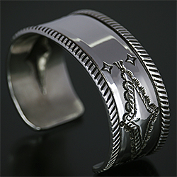 | NAVAJO/ナバホ族のアーティスト Clendon Pete/クレンドン・ピートに制作を依頼したバングルです。 10ゲージ(約2.6mm)の厚みのあるシルバー、静かなデザインの中に十分に存在感を発揮しています。 クレンドン・ピートの世界観をお楽しみください。 | ||