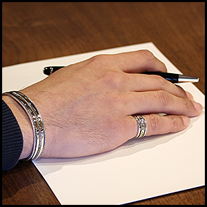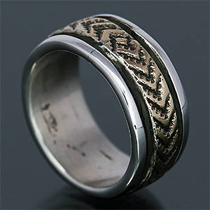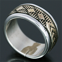 | NAVAJO/ナバホ族のアーティスト Bruce Morgan/ブルース・モーガンに制作依頼をしたリングです。 シンプルながらも深く正確なスタンプワーク、こちらのデザインは3ダイヤ+アローになります。 センターは14Kを使用しているため高級感があり、スタイルを選びませんので様々な場面でお使い頂けます。 | ||