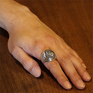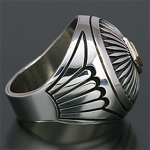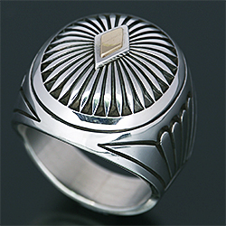 | NAVAJO/ナバホ族のアーティスト Howard Nelson/ハワード・ネルソンに制作を依頼したリングです。 パーツを組合わせ中空になるように仕上げられていますが、見た目だけでは分からない高い技術とセンスが必要とされる作品です。 ダイヤ型のパーツはダブルダイヤ(14Kゴールド/シルバー)での仕上がりで、緩やかなドーム状のアーチが印象的です。 現代のナバホジュエリーを象徴するデザインの一つサンバースト、溜息が出るくらい美しい仕上がりです。 | ||