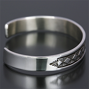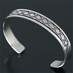 | NAVAJO/ナバホ族のアーティスト Bruce Morgan/ブルース・モーガンに制作を依頼したバングルです。 シンプルながらも深く正確なスタンプワーク、こちらのデザインはダイヤになります。 スタイルを選ばない着けやすさはもちろん、インディアンジュエリーが初めての方でも気軽にお楽しみ頂けます。 単体でも他のバングルとの重ね着けにも相性良くお使い頂けます。 | ||
