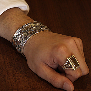 | NAVAJO/ナバホ族のアーティスト Clendon Pete/クレンドン・ピートに制作を依頼したバングルです。 9ゲージ(約2.9mm)の厚みのあるシルバー、1枚のシルバーの板から制作されています。 クレンドン・ピートの世界観を感じて頂ければと思います。 | ||
