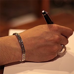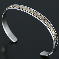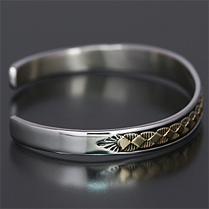 | NAVAJO/ナバホ族のアーティスト Bruce Morgan/ブルース・モーガンに制作を依頼したバングルです。 シンプルながらも深く正確なスタンプワーク、こちらはダイヤデザインになります。 センターラインは14Kを使用しているため高級感があり、スタイルを選びませんので様々な場面でお使い頂けます。 単体でも他のバングルとの重ね着けにも相性良くお楽しみ頂けます。 | ||