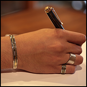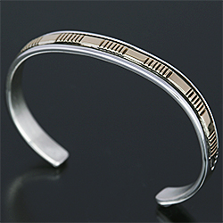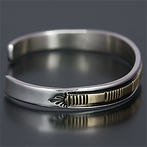 | NAVAJO/ナバホ族のアーティスト Bruce Morgan/ブルース・モーガンに制作を依頼したバングルです。 シンプルながらも深く正確なスタンプワーク、こちらはストライプ+プレーンデザインになります。 センターラインは14Kを使用しているため高級感があり、スタイルを選びませんので様々な場面でお使い頂けます。 単体でも他のバングルとの重ね着けにも相性良くお楽しみ頂けます。 | ||