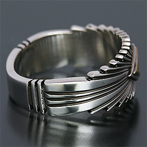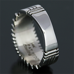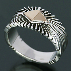 | NAVAJO/ナバホ族の女性アーティスト Patricia Bedonie/パトリシア・べドニーに制作依頼をしたリングです。 正確で美しいチゼルワークによるサンバーストデザインです。ダイヤ型のパーツは14Kとシルバーのダブルダイヤモンドで仕上げて頂いています。 側面は凹凸が鋭いエッジが効果的で、形状はテーパーになっているため指あたりがとてもよく、装着感の良いリングです。 | ||