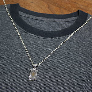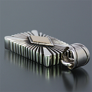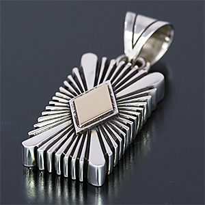 | NAVAJO/ナバホ族の女性アーティスト Patricia Bedonie/パトリシア・べドニーに制作依頼をしたペンダントです。 正確で美しいチゼルワークによるサンバーストデザインです。ダイヤ型のパーツは14Kとシルバーのダブルダイヤモンドで仕上げて頂いています。 #1フラットワイヤー(約5mm厚)を使用していますが、厚みがあるため側面のエッジがより際立っているのがよく分かります。 コンパクトなサイズながらもしっかりと主張している作品です。 | ||
