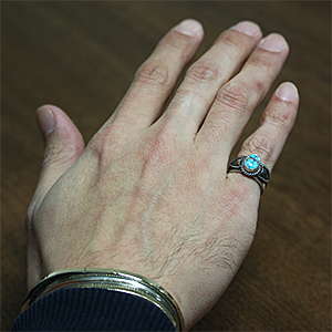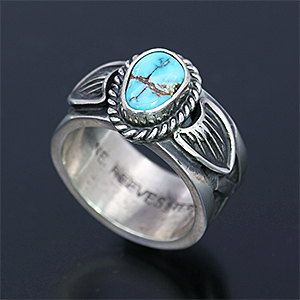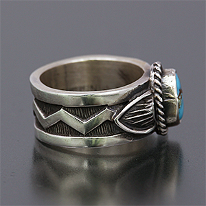 | NAVAJO/ナバホ族のアーティスト Sunshine Reeves/サンシャイン・リーブスに制作を依頼したリングです。 作家の特徴がしっかりと出ているスタンプワークに、パージャンターコイズをセットして頂いたナバホジュエリーを代表するようなスタイルの作品です。 主張しすぎないスタンプによるデザインは石とのバランスが良く、レディースサイズになりますが、男性の方であればピンキーリングとしてお楽しみ頂けるサイズ感です。 | ||