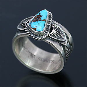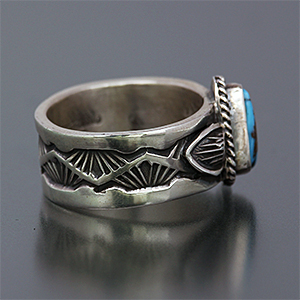 | NAVAJO/ナバホ族のアーティスト Sunshine Reeves/サンシャイン・リーブスに制作を依頼したリングです。 スタンプワークと、モレンシターコイズをセットして頂いたナバホジュエリーを代表するようなスタイルの作品です。 主張しすぎないスタンプによるデザインは石とのバランスが良く、メインでもサブでもお楽しみ頂けます。 | ||