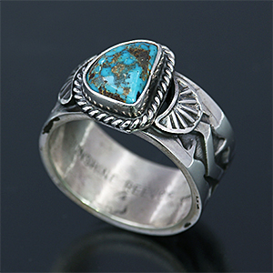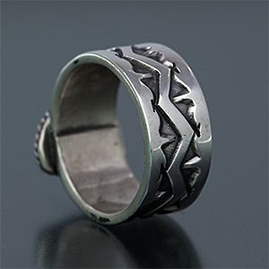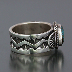 | NAVAJO/ナバホ族のアーティスト Sunshine Reeves/サンシャイン・リーブスに制作を依頼したリングです。 スタンプワークと、ロイストーンターコイズをセットして頂いたナバホジュエリーを代表するようなスタイルの作品です。 主張しすぎないスタンプによるデザインは石とのバランスが良く、メインでもサブでもお楽しみ頂けます。 | ||