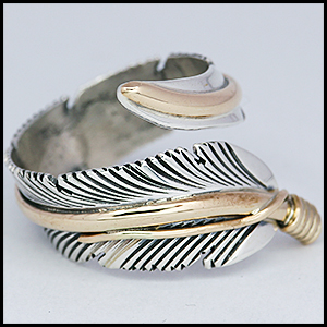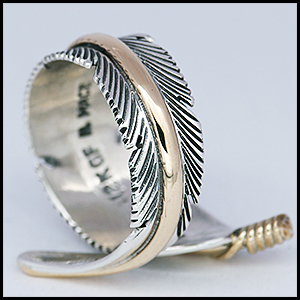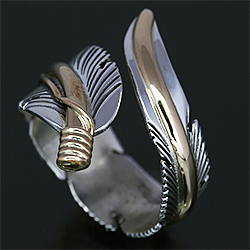 | NAVAJO/ナバホ族のアーティスト Harvey Mace/ハーヴィー・メイスに制作を依頼したリングです。 躍動感のあるフェザーモチーフのリングは、指を包み込むようなデザインに仕上がっています。 センターラインには12KGF(12金張り)が施されています。 美しい曲線と共にフェザーがしっかりとデザインされていますので、どなたでもお楽しみ頂ける作品です。 | ||