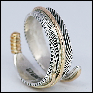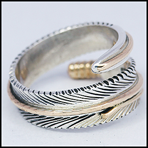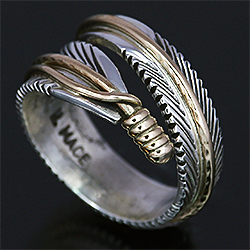 | NAVAJO/ナバホ族のアーティスト Harvey Mace/ハーヴィー・メイスに制作を依頼したリングです。 躍動感のあるフェザーモチーフのリングは、指を包み込むようなデザインに仕上がっています。 センターラインには12KGF(12金張り)が施されています。 美しい曲線と共にフェザーがしっかりとデザインされていますので、どなたでもお楽しみ頂ける作品です。 | ||