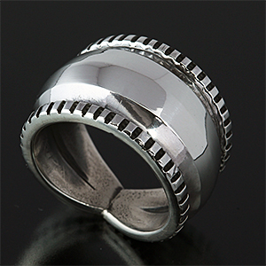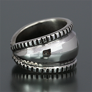 | NAVAJO/ナバホ族のアーティスト Harrison Jim/ハリソン・ジムに制作を依頼したリングです。 地金はインゴットシルバーによるもので、リポウズによる効果的な叩き出しで立体感が得られています。 通常表面はドーム状に仕上げられるものが多いですが、こちらの作品は角度が付けられていますので、光の変化をお楽しみ頂けます。 シンプルな中にもしっかりとした主張感を感じて頂けます。 | ||