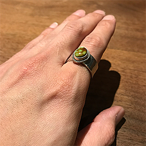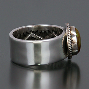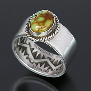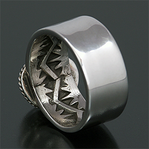 | NAVAJO/ナバホ族のアーティスト Sunshine Reeves/サンシャイン・リーブスに制作を依頼したリングです。 表面はプレーン、内側にスタンプを施して頂きました。石はキャリコレイク、美しい鏡面仕上げとの相性は抜群です。 ファッションに溶け込む自然な雰囲気、スタイルの幅を広げてくれる作品です。 | ||