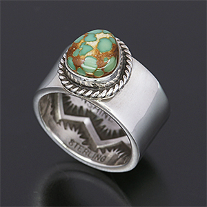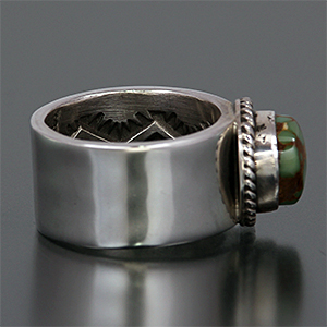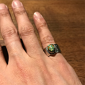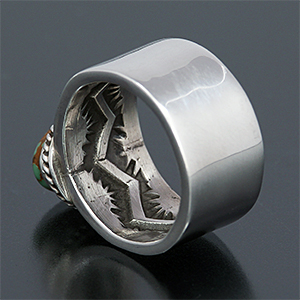 | NAVAJO/ナバホ族のアーティスト Sunshine Reeves/サンシャイン・リーブスに制作を依頼したリングです。 表面はプレーン、内側にスタンプを施して頂きました。石はキャリコレイク、美しい鏡面仕上げとの相性は抜群です。 ファッションに溶け込む自然な雰囲気、スタイルの幅を広げてくれる作品です。 | ||