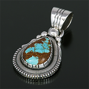 | NAVAJO/ナバホ族のアーティスト Will Vandever/ウィル・バンデバーに制作を依頼したペンダントです。 石の魅力を最大限に引き出したワイヤーワーク、石はナンバーエイト(ターコイズ)を使用しています。 チェーンホールが大きいためビーズチェーンなどの太めのチェーンと組合すことが可能です。 | ||