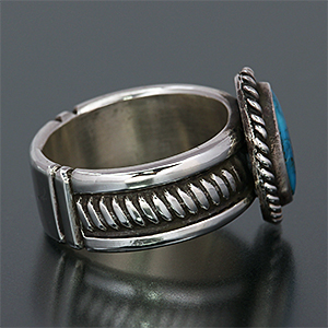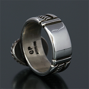 | NAVAJO/ナバホ族のアーティスト Clendon Pete/クレンドン・ピートに制作を依頼したリングです。 石はモレンシをセットして頂きましたがシンプルなスタンプとのバランスが良く、落ち着いた雰囲気のある作品に仕上がりました。 両サイドのスタンプは新しい鏨によるもので、こちらのリングに使用するために制作されています。 | ||