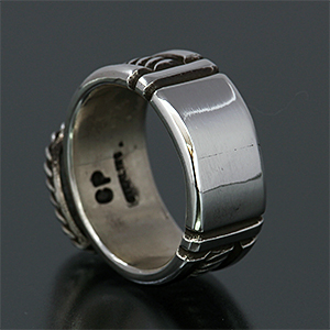 | NAVAJO/ナバホ族のアーティスト Clendon Pete/クレンドン・ピートに制作を依頼したリングです。 石はモレンシをセットして頂きましたがシンプルなスタンプとのバランスが良く、落ち着いた雰囲気のある作品に仕上がりました。 両サイドのスタンプは新しい鏨によるもので、こちらのリングに使用するために制作されています。 | ||