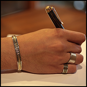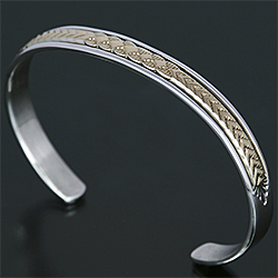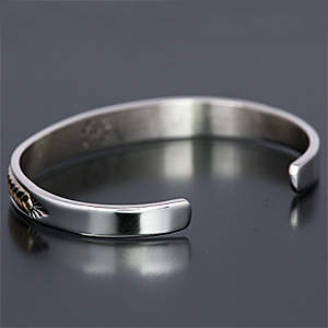 | NAVAJO/ナバホ族のアーティスト Bruce Morgan/ブルース・モーガンに制作を依頼したバングルです。 シンプルながらも深く正確なスタンプワーク、こちらのデザインは4ダイヤ/アローになります。 センターラインは14Kを使用しているため高級感があり、スタイルを選びませんので様々な場面でお使い頂けます。 単体でも他のバングルとの重ね着けにも相性良くお楽しみ頂けます。 | ||