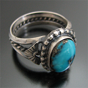 | NAVAJO/ナバホ族のアーティスト Terry Martinez/テリー・マルチネスがモレンシターコイズ(Morenci)を使用して制作したリングです。 兄【カルヴィン・マルチネス】弟【リック・マルチネス】共に賞を獲得している人気のアーティストです! 爽やかなブルーカラーに銀色のパイライトが入っているモレンシを大胆に使用し、ナバホ族らしいトラディショナルなスタイルに仕上がっており、艶消しで落ち着いた雰囲気が特徴の逸品でございます! コンパクトでスタイリングしやすい、オスススメのアイテムでございます♪ サイズ変更も可能ですので、お気軽にお問合わせくださいませ。 | ||