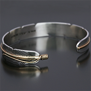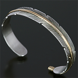 | NAVAJO/ナバホ族のアーティスト Harvey Mace/ハーヴィー・メイスに制作を依頼したバングルです。 躍動感のあるフェザーモチーフの作品です。 センターラインは12KGF(12金張り)が使用されているため、上品で落ち着いた雰囲気があります。また、シルバーとのカラーバランスが絶妙です。 美しい曲線と共にフェザーがしっかりとデザインされていますので、どなたでもお楽しみ頂ける作品です。 | ||