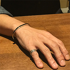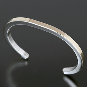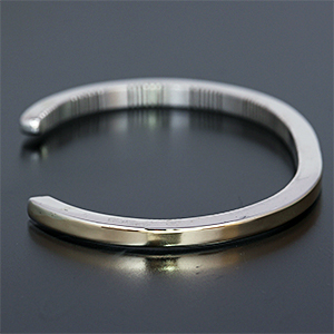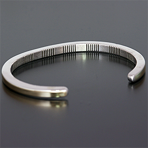 | NAVAJO/ナバホ族のアーティスト Bruce Morgan/ブルース・モーガンに制作を依頼したバングルです。 RIVER MAILの別注による#6スクエアワイヤーを使用した作品です。 トップ部分は14Kを使用しており、厚み幅ともに約4mmのシルバーワイヤーを使用しています。表側は簡素な美が追及されたプレーン、裏側にストライプ+プレーンのデザインを施して頂きました。 単体でお使い頂くのも良いですが、他のバングルと重ね着けにも重宝する作品です。 | ||