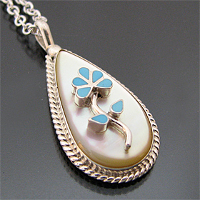 | ZUNI/ズニ族の人気アーティスト Lamar Lasilooが制作したネックレスです。 イエローシェルをベースに、フラワーモチーフでターコイズがインレイされている、とっても可愛い仕上がりとなっています! 小ぶりでスタイリングしやすいアイテムですので、さりげなくお使いいただけます♪ | ||