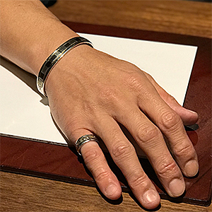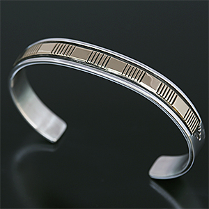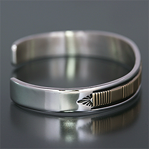 | NAVAJO/ナバホ族のアーティスト Bruce Morgan/ブルース・モーガンに制作を依頼したバングルです。 シンプルながらも深く正確なスタンプワーク、こちらのデザインはストライプ+プレーンになります。 センターラインは14Kを使用しているため高級感があり、スタイルを選びませんので様々な場面でお使い頂けます。 単体でも他のバングルとの重ね着けにも相性良くお楽しみ頂けます。 | ||