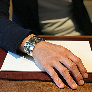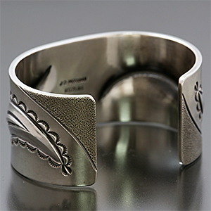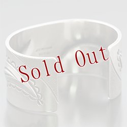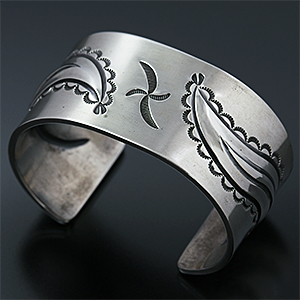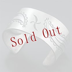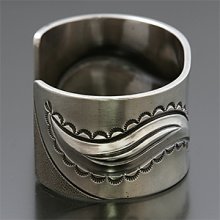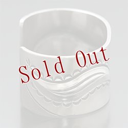 | NAVAJO/ナバホ族のアーティスト Jacob D. Morgan/ジェイコブ・モーガンに制作を依頼したバングルです。 12GのシルバープレートにリポウズによるBi-Curveデザイン、センターにはWind(風)を表すスタンプ、そして両エンドにはエングレーヴィングが施されています。 ジェイコブ・モーガンが手掛けるナバホジュエリー、どうぞお楽しみください。 | ||