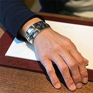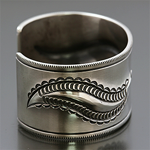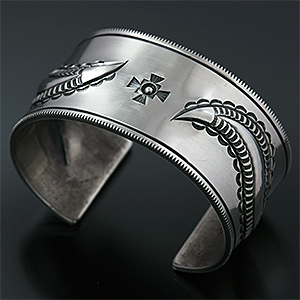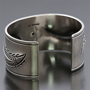 | NAVAJO/ナバホ族のアーティスト Jacob D. Morgan/ジェイコブ・モーガンに制作を依頼したバングルです。 12GのシルバープレートにリポウズによるBi-Curveデザイン、センターにはニューメキシコ州を表す州旗のスタンプ、そして両サイドのコーナーにはヤスリ掛けによる効果的なデザインが印象的です。 ジェイコブ・モーガンが手掛けるナバホジュエリー、どうぞお楽しみください。 | ||