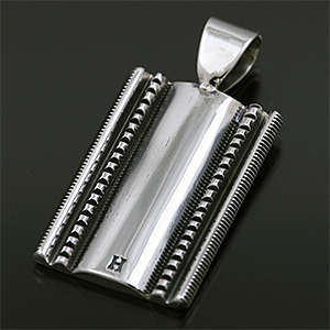 | Navajo/ナバホ族のアーティスト Harrison Jim/ハリソン・ジムに制作を依頼したペンダントです。 地金はインゴットシルバーによるもので、シールドをイメージした作品に仕上げて頂きました。 チゼルワーク、ファイルワーク、そしてコインエッジ、限られたサイズで作家のセンスと巧さが表現された作品です。 | ||