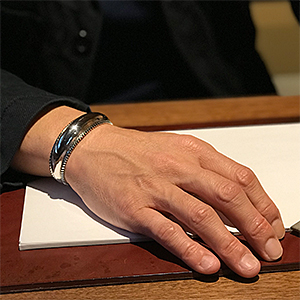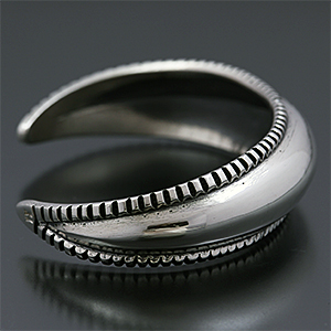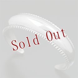 | Navajo/ナバホ族のアーティスト Harrison Jim/ハリソン・ジムに制作を依頼したバングルです。 地金はインゴットシルバーによるもので、約21mm幅の中に表現された世界観は作家が長年かけて見出したスタイルが反映されています。 テーパー付きのシャープな印象と力強さが感じられるリポウズによる立体感、シンプルな美が追及された作品をお楽しみください。 | ||