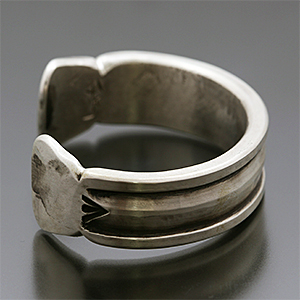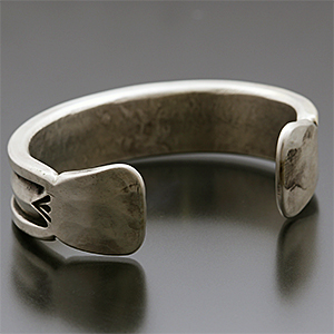 | Blackfoot/ブラックフット族のJames Faks/ジェームス・フォックスに制作を依頼しバングルです。 #1フラットワイヤー(6ga/約4.2mm厚)を使用した作品です。 チェイシングと言われる鏨を用いることで、シルバーに角度を付けて立体的に表現されています。 経年変化と共に素朴な風合いをお楽しみください。 | ||