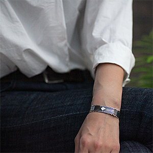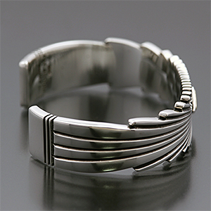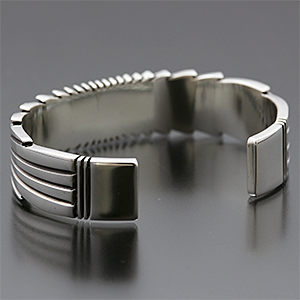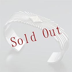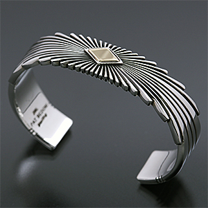 | Navajo/ナバホ族の女性アーティスト Patricia Bedonie/パトリシア・べドニーに制作依頼をしたバングルです。 中心から外側に向かって大きく広がるサンバースト(太陽光線)をイメージした代表的作品です。 ダイヤ型のパーツは14Kとシルバーの組合せになります。美しいラインは正面だけでなく側面にも施されており、凹凸のある立体的な作品です。 スタイルを選ばない安定感のある着けやすをお楽しみください。 | ||
