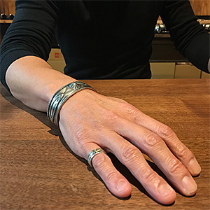 | Creek/クリーク族のアーティスト Jesse Robbins/ジェシー・ロビンズに制作依頼をしたバングルです。 コインシルバーから成形された地金はターミナルに向けて細くなっていく形状です。地金はハンマーでパウンディングされた形跡がしっかりと残っており、素材の良さとジェシーが手掛けるオールドスタイルが上手く組み合わさっています。 ジェシー・ロビンズが手掛けるジュエリー、どうぞお楽しみください。 | ||
