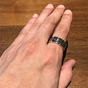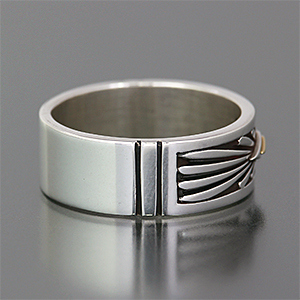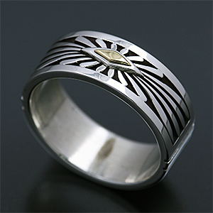| Navajo/ナバホ族のアーティスト Howard Nelson/ハワード・ネルソンに制作を依頼したリングです。 約8mm幅の中に表現されたサンバースト、美しいシャープなラインが印象的です。ダイヤ型のパーツはダブルダイヤ(18Kゴールド/シルバー)での仕上がりです。 シンプルにスタイルをお楽しみ頂ける作品です。 | ||
