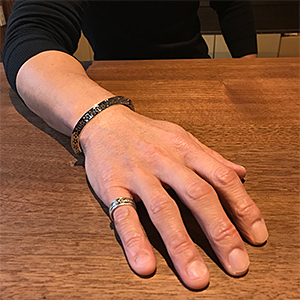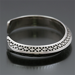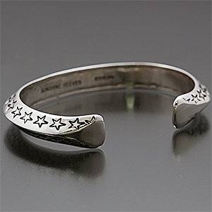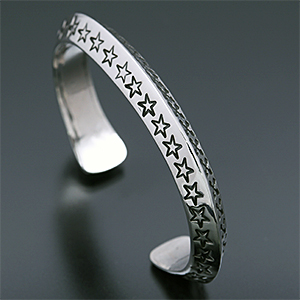 | Navajo/ナバホ族のアーティスト Sunshine Reeves/サンシャイン・リーブスに制作を依頼したバングルです。 デザインはスター/Wアロー、シンプルで飽きの来ないサンシャインリーブスのスタイルです。 デザインはシンプルでスタンプも多用していませんが、スタンプを打つ時に反対側は見えませんので、ずれないようにする為に気を使いながらスタンピングしていきます。 単体でも重ね着けにも重宝する作品です。 | ||
