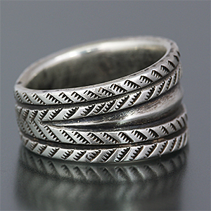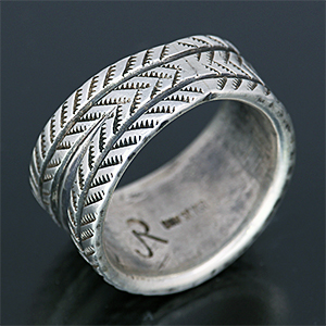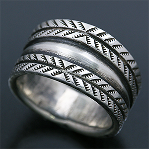 | Creek/クリーク族のアーティスト Jesse Robbins/ジェシー・ロビンズに制作依頼をしたリングです。 コインシルバーから成形された地金に古い鏨を用いて制作されています。 チゼルワークによるシンプルなデザインは使い込むほどに味わい深い風合いを増していきます。 | ||