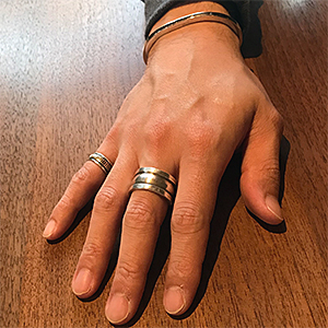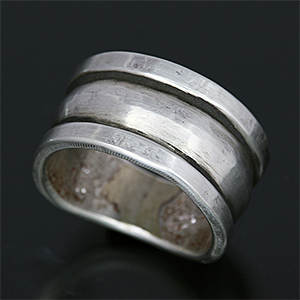 | Blackfoot/ブラックフット族のJames Faks/ジェームス・フォックスに制作を依頼しリングです。 12ga(約2.03mm)厚みのあるシルバープレートを使用した作品です。 チェイシングと言われる鏨を用いることで、シルバーに角度を付けて立体的に表現されています。 シンプルでスタイルを問わない着けやすさをお楽しみください。 | ||
